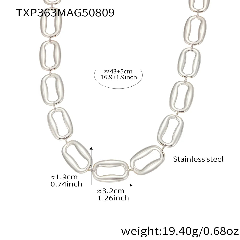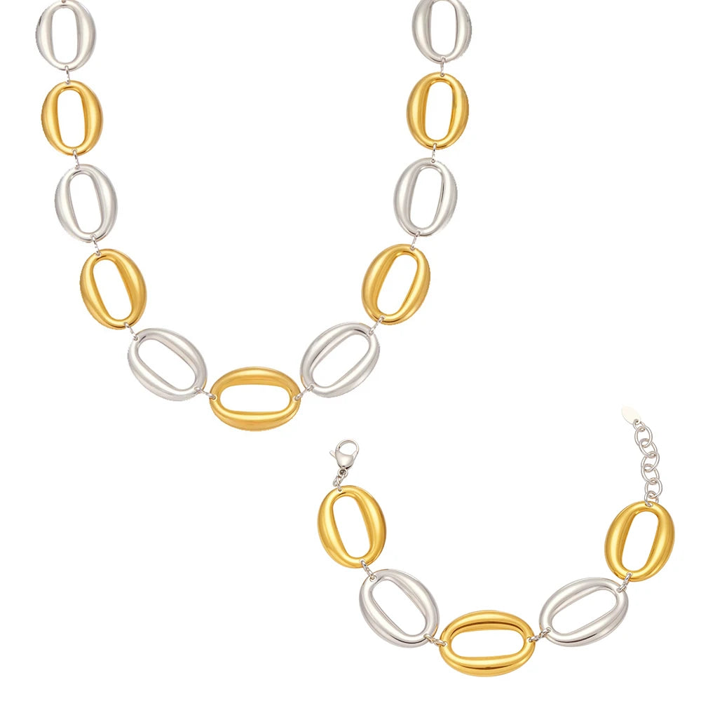 Elevate your style with this bold gold chunky oval link necklace and bracelet set. Crafted from high-quality stainless steel with a glossy gold finish, this statement jewelry set is perfect for modern, elegant looks. Tarnish-resistant and durable, this matching necklace and bracelet pair adds instant sophistication to any outfit—ideal for daily wear, parties, and gifting.