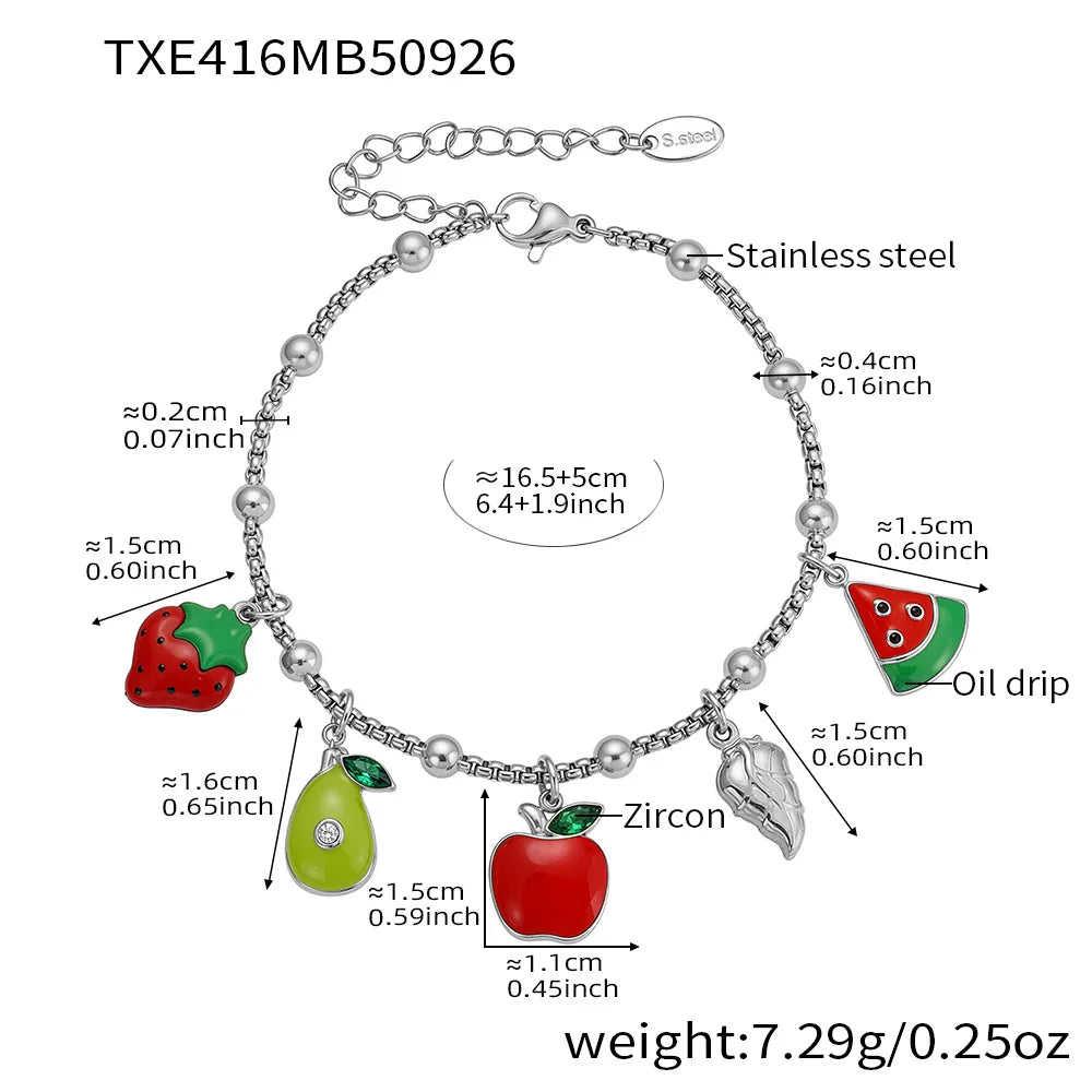 Add a playful touch to your look with the Lucia Gole fruit charm necklace and bracelet set. Featuring gold-tone chains adorned with colourful fruit charms, this statement jewelry set blends fun, femininity, and effortless elegance. Perfect for layering or wearing alone, day to night.