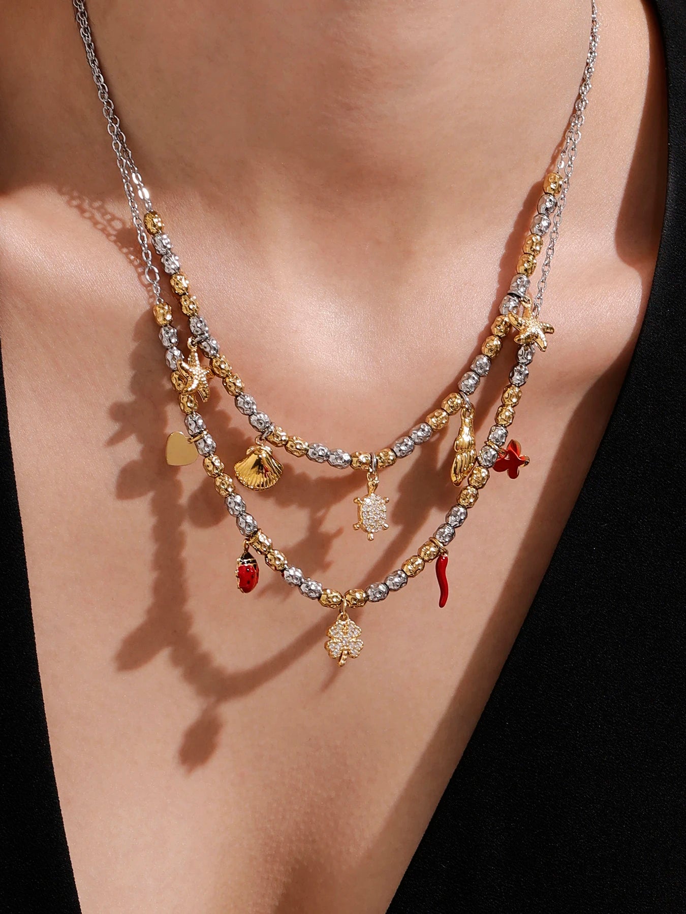 Lucia Gole layered gold charm necklace and bracelet set featuring mixed metal beads and ocean-inspired charms including shells, turtles, stars, and coral accents. Designed for effortless layering, this fashion jewelry set adds a playful yet luxe touch to everyday outfits, beach looks, and evening styling. Lightweight, eye-catching, and perfect for stacking or wearing together.