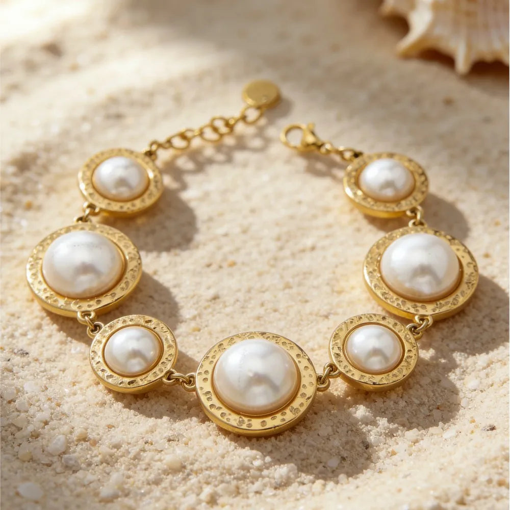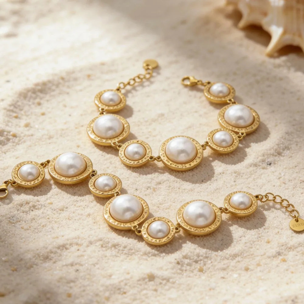The Lucia Gole gold pearl bracelet and ring set blends timeless pearls with modern sculptural design. Featuring luminous round pearls framed in textured gold settings, this elegant set is designed to elevate both everyday looks and special occasions. Wear together for a refined statement or style separately for effortless sophistication.