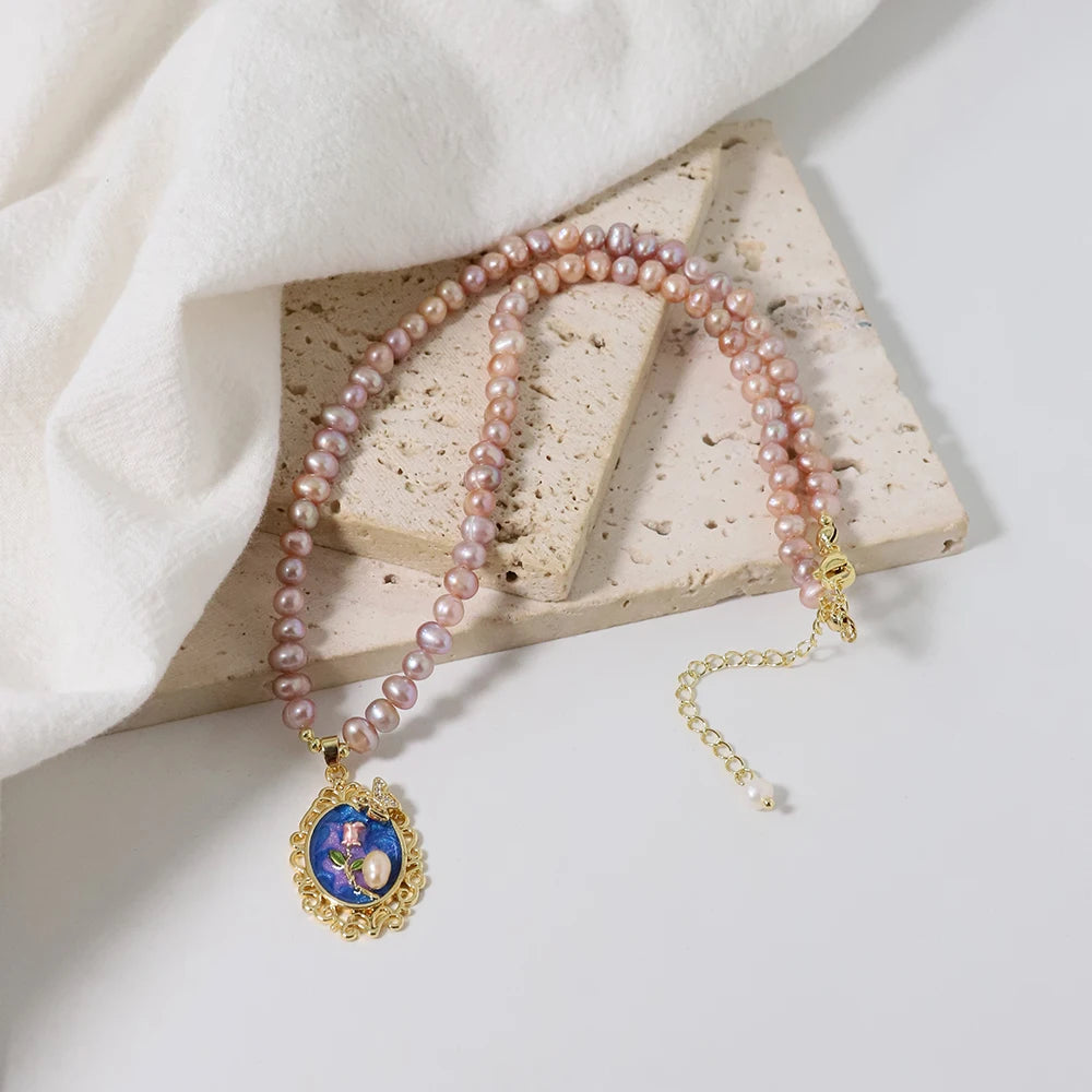 Natural Pearl Oil Painting Rose Butterfly Necklace Korean Style Women Luxury Jewelry Fashion Ladies and Girls Gift GN0667